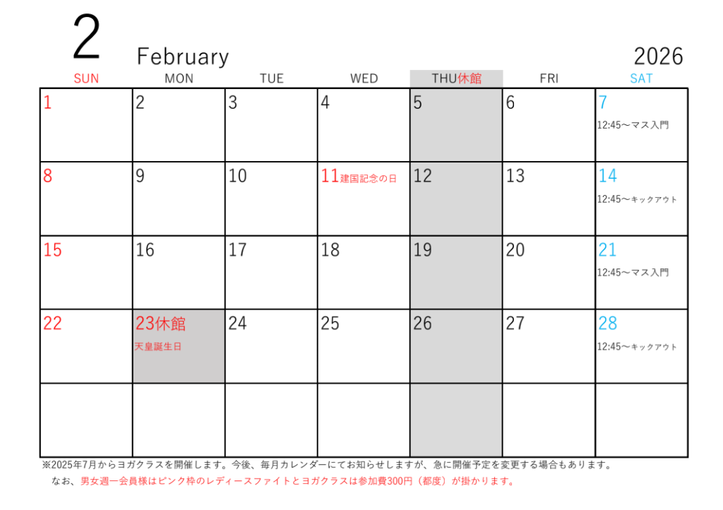 当キックボクシングジムの来月のカレンダーになります。