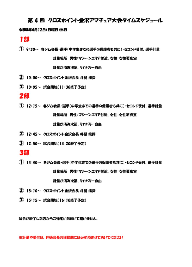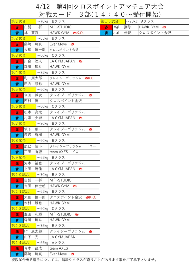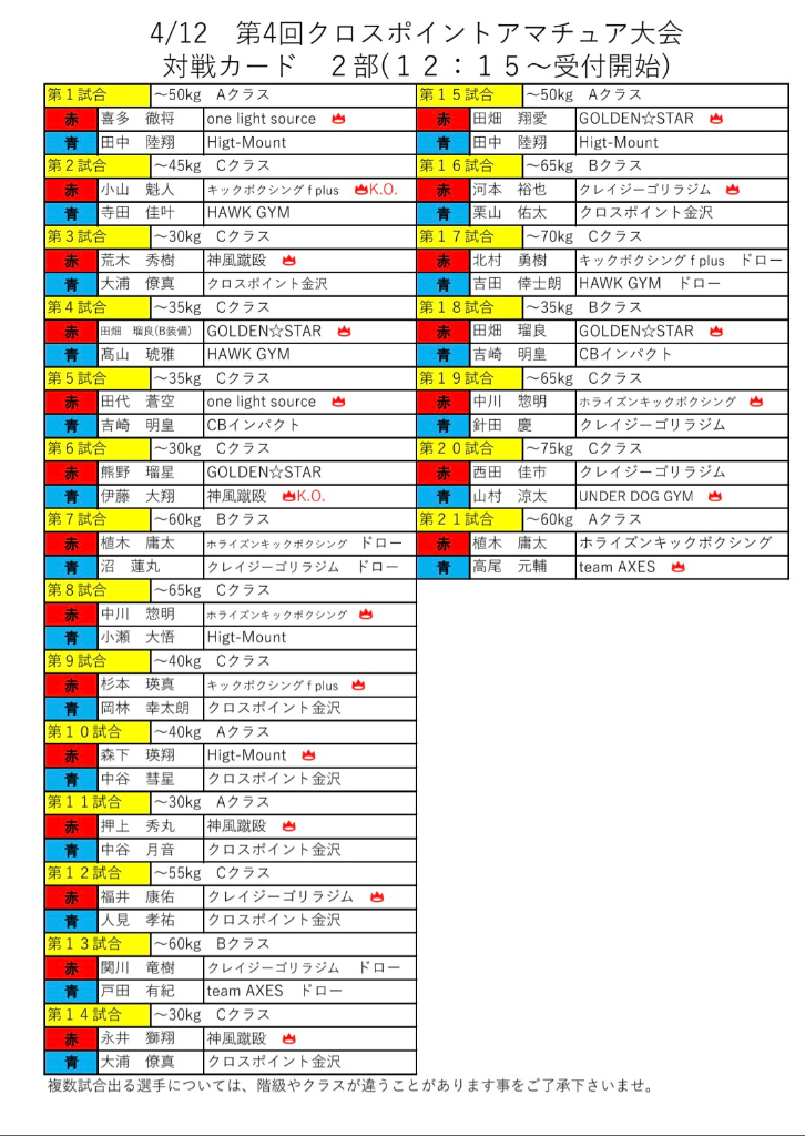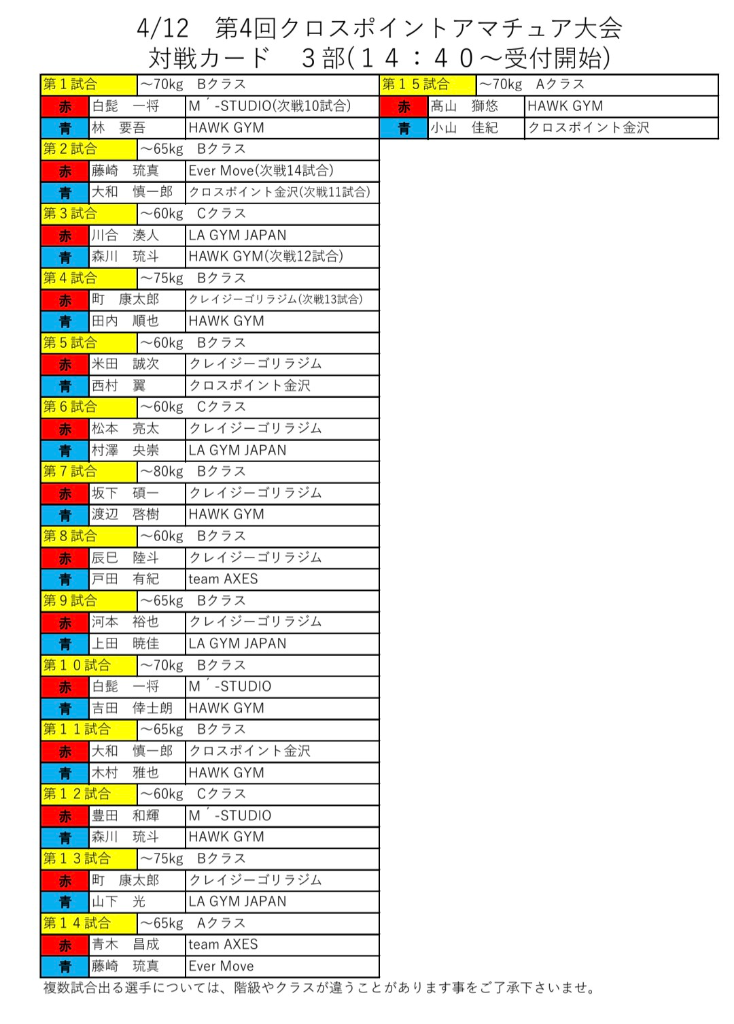 4月12日 クロスポイント金沢 第4回 アマチュアキックボクシング大会 対戦表