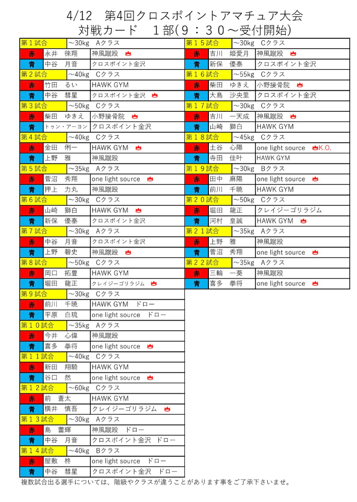 blog ブログ 2026/04/17 5月から、再度時間割りを見直します 2026/04/13 第4回クロスポイント金沢アマチュアキックボクシング大会試合結果 2026/04/08 4月12日 クロスポイント金沢 第4回 アマチュアキックボクシング大会 対戦表 MORE about 当ジムについて MORE menu メニュー/料金 キャンペーン more コース案内 more 料金 more MORE first 初めての方へ MORE faq よくある質問 レッスン時間はどれくらいですか? 1レッスン60分+フリー指導(20~30分)となります。 レッスンはマンツーマンで行いますか? マンツーマンではなく、複数人でレッスンを行っていきます。ただし、無料体験時やご入会後にキックボクシングに慣れるまでは、当ジムのインストラクターがマンツーマンでご指導いたします。 レッスンに必要な道具はどこで購入できますか? 当ジム内でも必要な備品をお安く販売しております。※キャンペーンによってはグローブのプレゼント企画も実施しています。詳しくは【メニュー/料金】のキャンペーンをご覧ください。 MORE