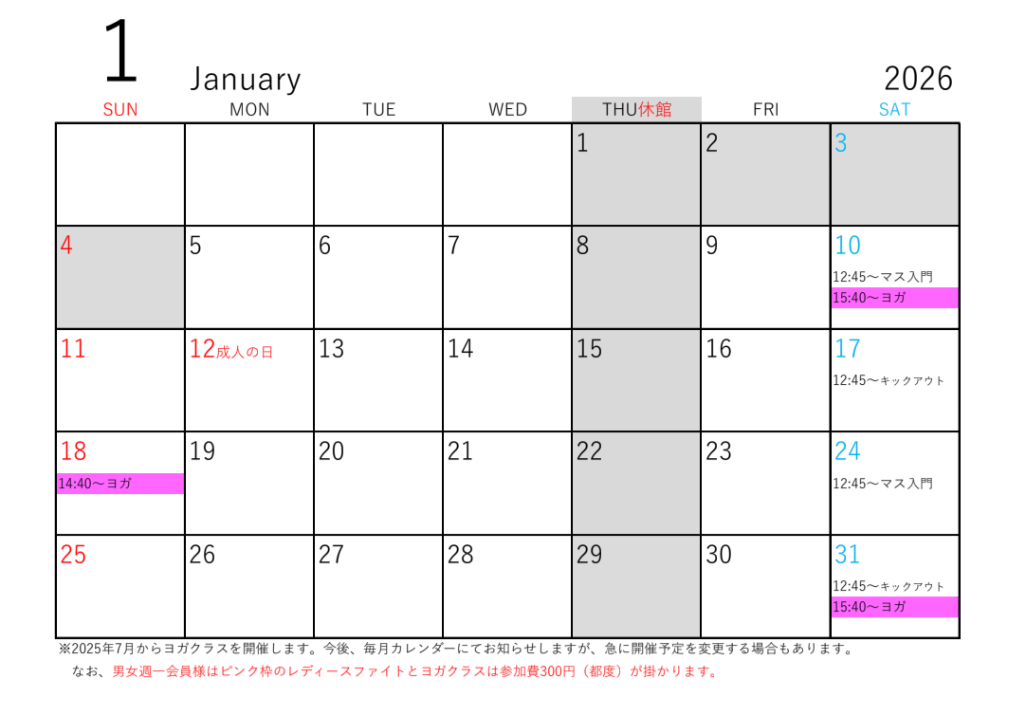少しだけ変更点があります。火曜の11時と金曜の20時は『基礎特訓クラス』になります。なお、レディースファイトクラスが無くなります。