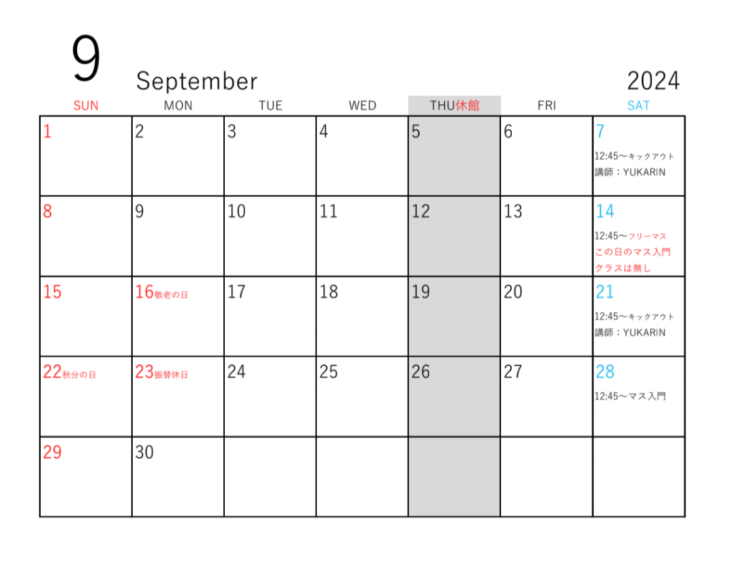 それではその9月の当キックボクシングジムのカレンダーを発表します。