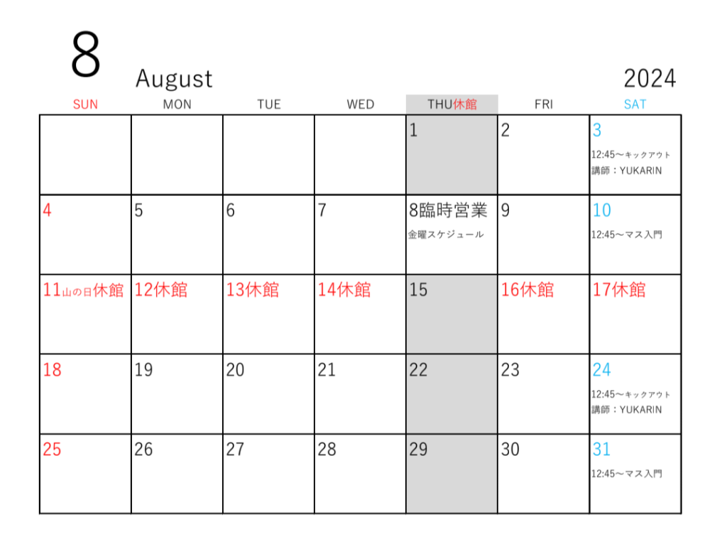 そんな子供たちをディスったところで、改めて当キックボクシングジムの8月の予定やキャンペーンを紹介したいと思います。