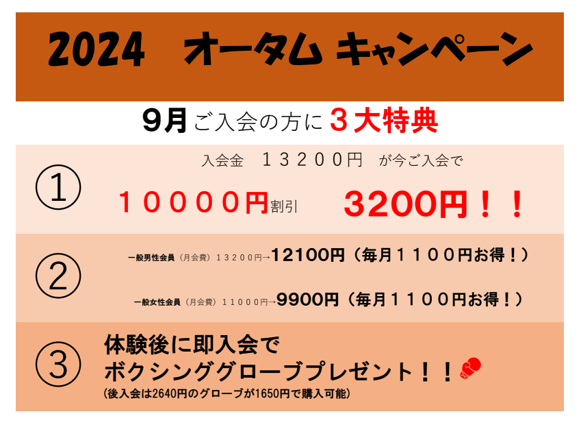 ②入会キャンペーンといたしまして『オータムキャンペーン』と題し(秋にしては暑い日が続きますが、、、)入会金の割引や月会費の割引など、安い価格でキックボクシングを始めるキッカケになればなと^^