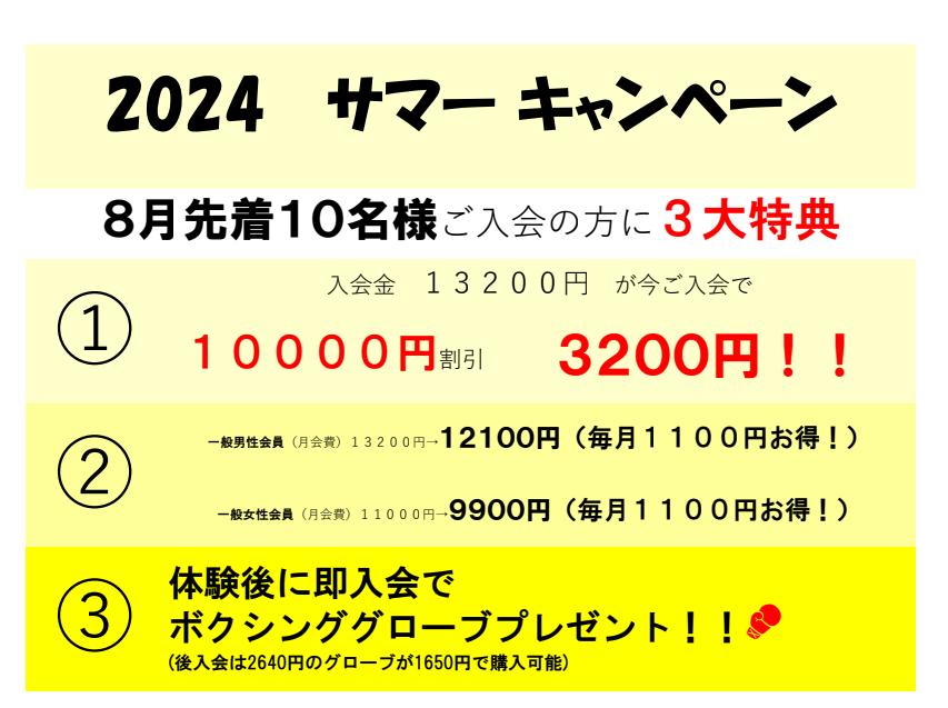 内容自体は7月のキャンペーンと変わりませんが、先着順でキャンペーンが受けれるのでぜひキックボクシングを始めてみたいという方は早めに登録することをおすすめします^^