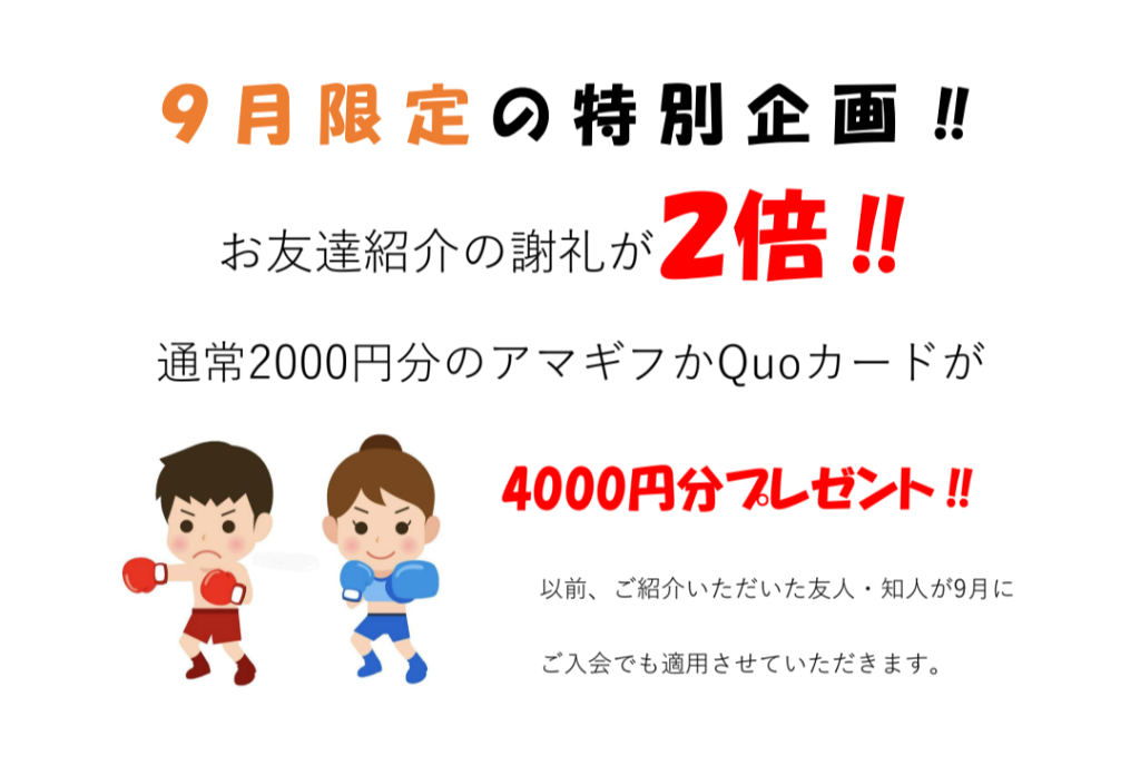 ③お友達紹介キャンペーンの紹介者に対するお礼が二倍のキャンペーン!!ぜひお友達やご家族をお誘いして、一緒にキックボクシングを楽しみませんか?