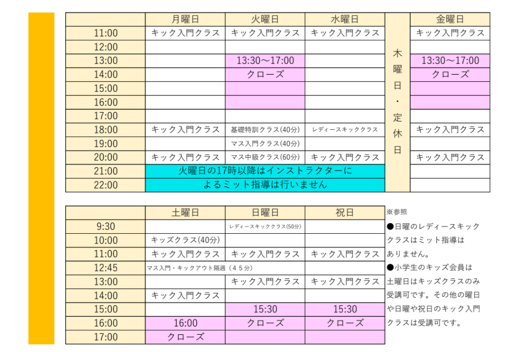 他の曜日のキック入門クラスは受講可です。
