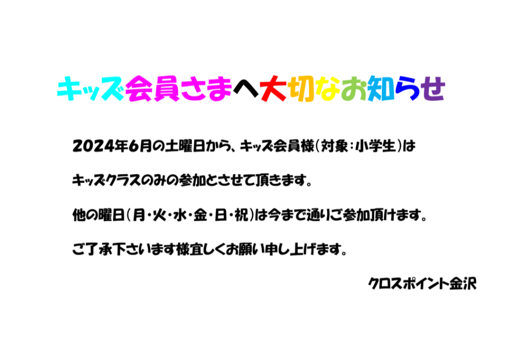 2024年6月の土曜日から、キッズ会員様(対象:小学生)はキッズクラスのみの参加とさせて頂きます。