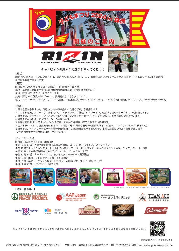 今回は認定NPO法人ピースプロジェクト様が主催で、協力企業も錚々たる企業で千裕選手はこのイベントのゲストっていう立ち位置なんでしょうか。