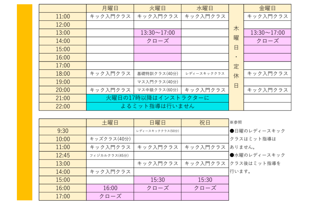 最後に、先月の4月から土曜日にフィジカルクラスを増やしたので、時間割を再告知させて頂きます。