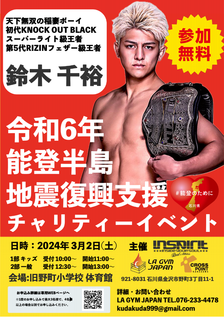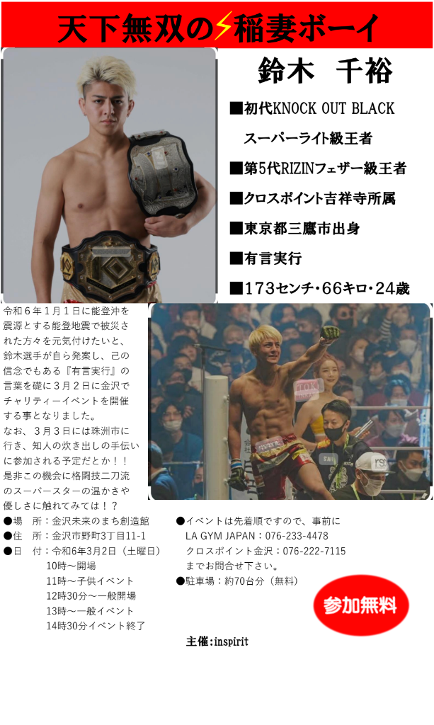 3月2日に金沢市にチャリティーイベントに来てくれる鈴木千裕選手の場所などの詳細が決まりましたのでお知らせ致します^^
