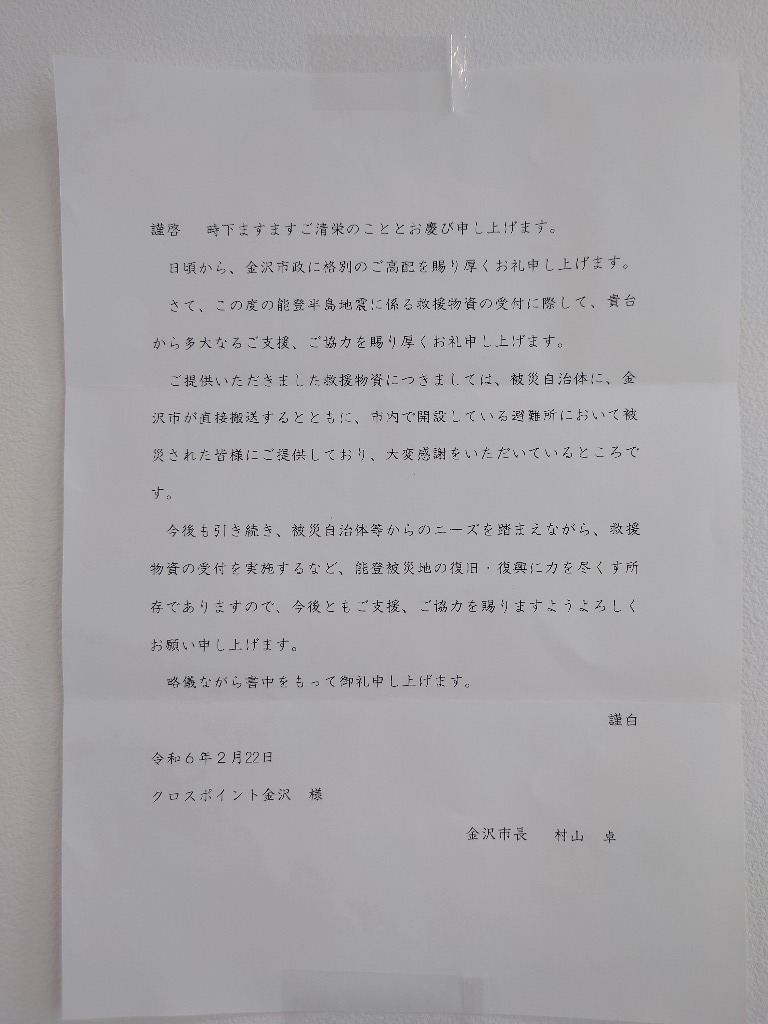 そうです、1月初旬に当ジムからの呼び掛けで会員の皆様から被災者に向けて頂いた、2tダンプ1台分にもなる支援物資に対するお礼状でした!!