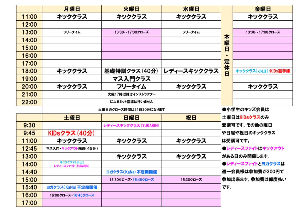 思えば最初はキックボクシングのみのクラスでしたが、今ではキックアウト(リズミックキックボクシング)やヨガ、そしてキックアウトやヨガに各1名ずつのインストラクターの他に、キックボクシングのインストラクターも2名と個性溢れるクラスが増えました!!