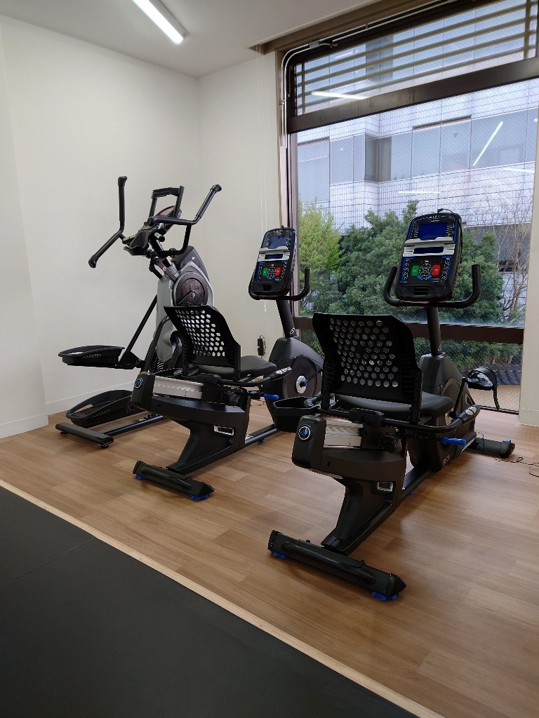 窓際の明るい日差しが差し込む場所に4種類のトレーニングマシーンをご用意しております。