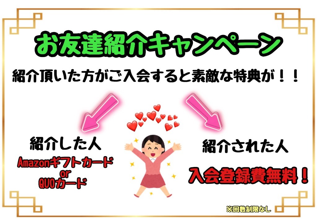 ご紹介頂いたお友達が入会する度に2,000円分のクオカードかアマギフプレゼント!!